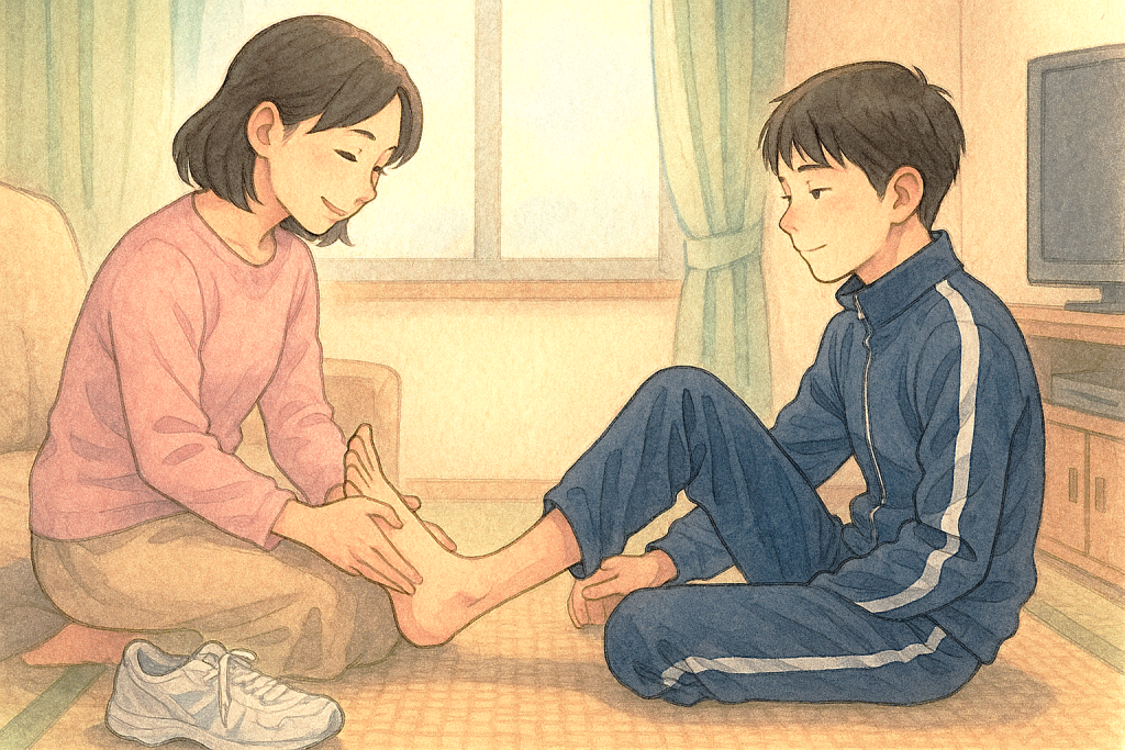 恥ずかしがって、手などはさわらせてくれませんが、足の花まるタッチはきにいっているようです。普段は口数がすくない方ですが、花まるタッチをしている時は、部活のことや心にあることを話してくれます。とても大切な時間です。(部活がんばっている中学男子のママより)