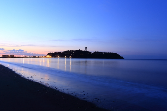 江の島や富士山を望む、雄大な景観が楽しめる片瀬西浜からの朝の景色です。
